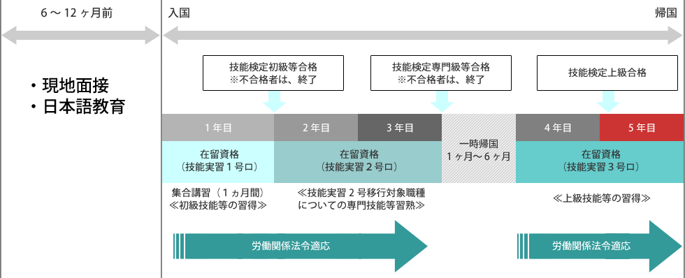 外国人技能実習制度は、新興国等の労働者を「技能実習生」として受入れ、貴社(受入企業)において技能実習を行いながら、知識・技能を習得させて、新興国の技術発展に寄与する国際貢献を目的とした国の制度です。 受け入れした外国人技能実習生に対して、1年間以内に産業・職業上の技術・技能・知識の習得を受入れ企業が支援を行います。そして2年目以降は、実習期間(1年以内)と合わせて最長で3年間の間、実習によって習得した技術・技能・知識を実践的かつ実務的に習熟できるよう受入れ企業が支援します。